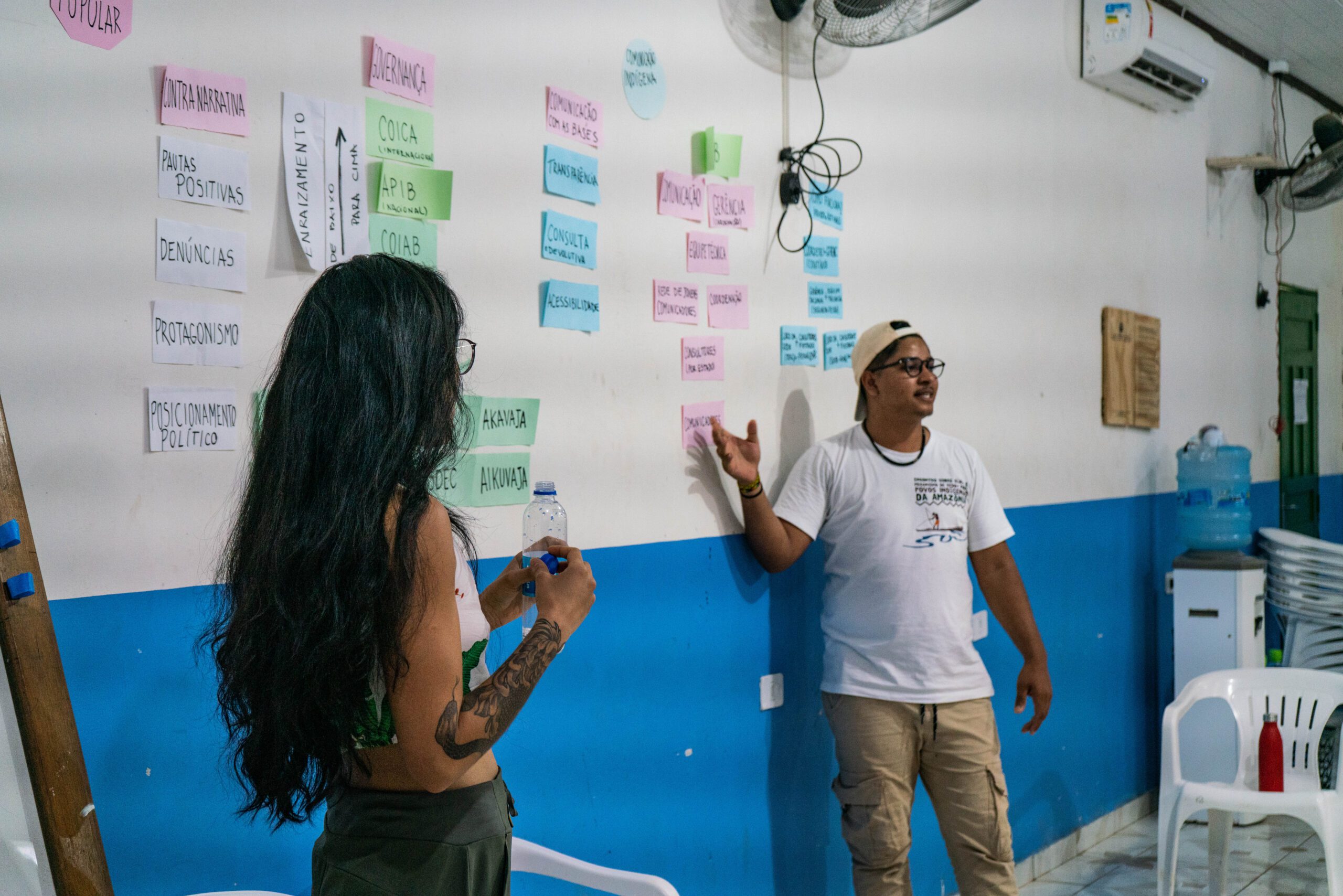 Desde o início, ficou evidente o desejo da Univaja em organizar uma frente interna de comunicação. Para isso, consideramos fundamental contar com a presença ativa da coordenação da Univaja e representantes das organizações que compõem a sua base. Em nossa metodologia, acreditamos que o envolvimento direto das coordenações políticas é essencial para que a comunicação se conecte profundamente à estratégia política da organização. Além disso, incentivamos o intercâmbio com a coordenação da Rede de Jovens Comunicadores da COIAB, visando fortalecer tanto os comunicadores quanto a coordenação da Univaja, facilitando o intercâmbio e a troca de experiências, consolidando relações entre redes já existentes, uma vez que a COIAB atua regionalmente em toda a Amazônia e a Univaja historicamente possui uma conexão política com eles.